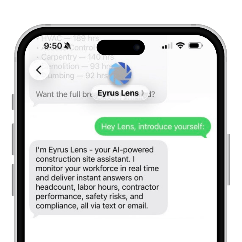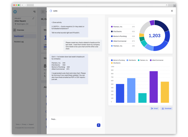 Chat with Lens inside the Eyrus platform. Lens will produce data, documents, and graphs all within Eyrus chat.